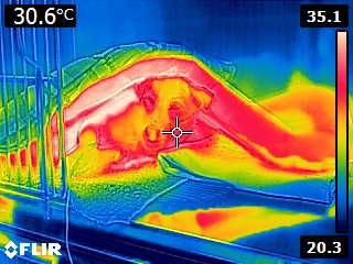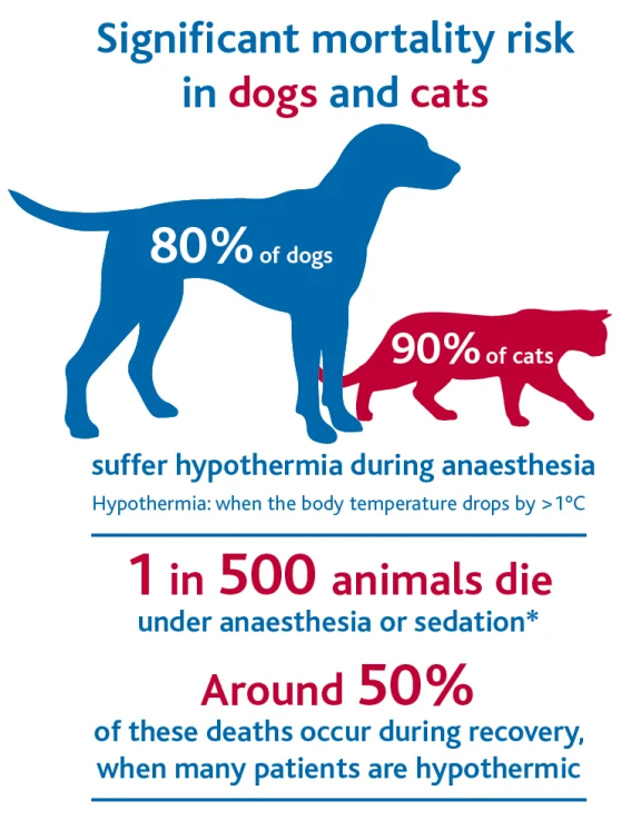 Peri-anaesthetic hypothermia (body temperature below 36oC or 97oF) occurs in up to 80% of anaesthetised cats and dogs. This can be due to their small body size, altered peripheral perfusion from premedication & anaesthetic drugs, intubation by-passing the nose, inhaling cold gases, and heat loss from skin surface or open body cavities.