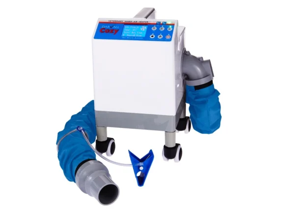 The Cozy Warm Air Heater is compact and quiet with wheels integrated into the chassis. It has a built-in HEPA filter to ensure that the warm air is cleaner than the air in the kennels or operating theatre. The low-cost filter is replaced by the end user (minimum 500 hours or every 6 months) as is the heater hose.