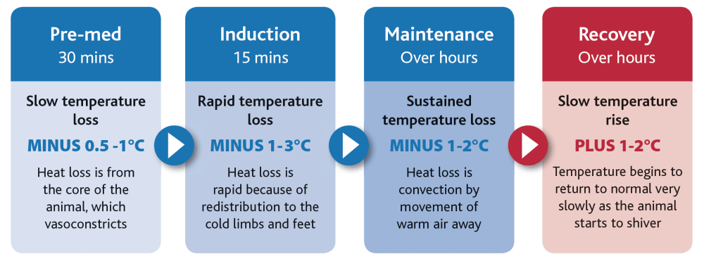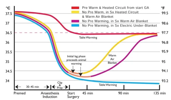 Peri-anaesthetic heat loss is exponential. Premedication causes vasodilation leading to mild hypothermia; dogs and cats typically lose up to 1oC (2oF) over 30 to 60 minutes before anaesthesia induction. This initial drop in core body temperature precedes the precipitous, critical heat loss that occurs in the first 15 to 30 minutes following induction, also caused by vasodilation then shunting of blood to the periphery causing up to 4oC (7oF) of heat loss during clip & prep time. Once animals are draped for surgery, heat loss slows.