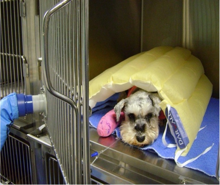 Over-blanket in recovery kennel. A similar technique can used to pre-warm patients